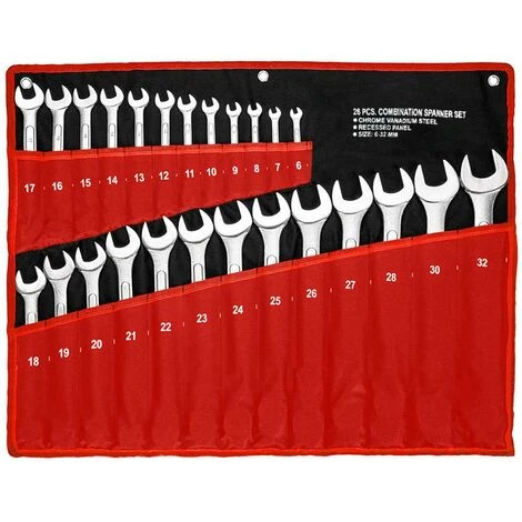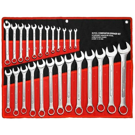 Il set comprende 25 chiavi per dadi in acciaio al carbonio delle seguenti misure: 6, 7, 8, 9, 10, 11, 12, 13, 14, 15, 16, 17, 18, 19, 20, 21, 22, 23, 24, 25, 26, 27, 28, 30, 32.